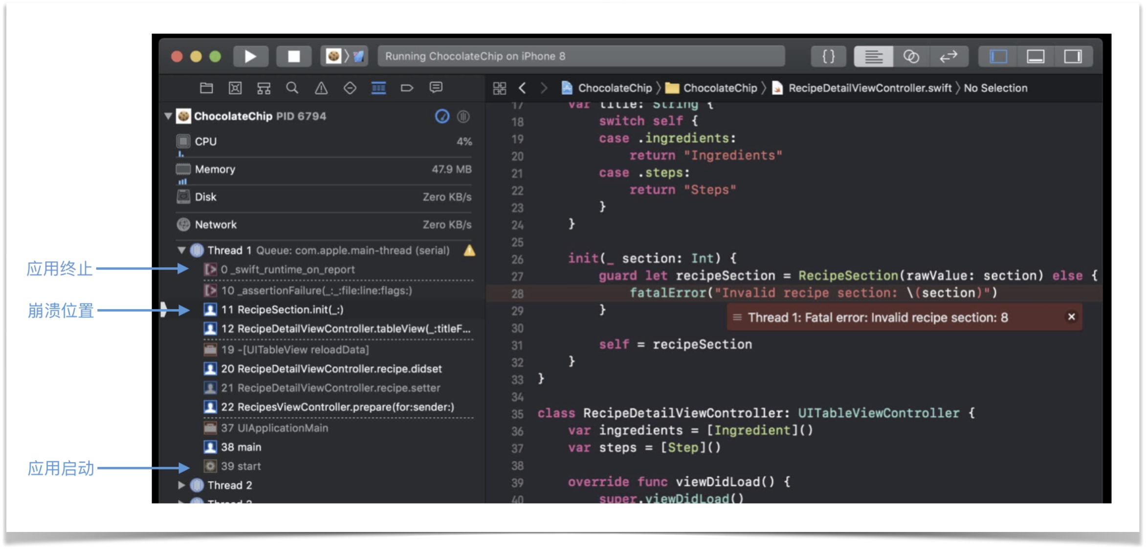 如上图的崩溃类型为 EXC_BAD_INSTRUCTION,它代表 CPU 尝试在执行一段不存在或无效的代码,而导致进行被“杀死”。
