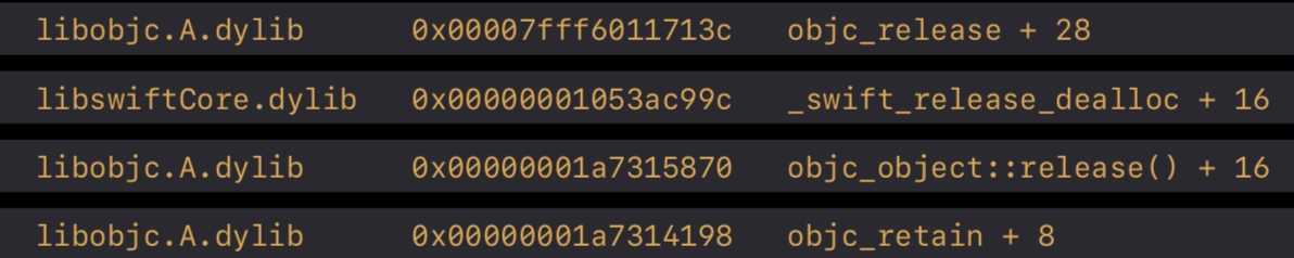 我们不需要理解每一行汇编的意思,每行后面的注释可以帮助我们理解,根据注释可以知道 1、2、3 处代码分别代表着 userName、database、views 的释放。回到上面提到的 +42,我们找到第3处的第一行,有一点需要注意的是大部分情况下汇编的偏移地址是返回地址,所以调用 objc_release 是在上一行。所以可以判断出是在释放 database 时出现了问题。虽然我们目前还不知道具体问题所在,但是可以通过这些信息缩小查找问题的范围,可以查找使用到 database 的地方,来找到真正的问题所在。