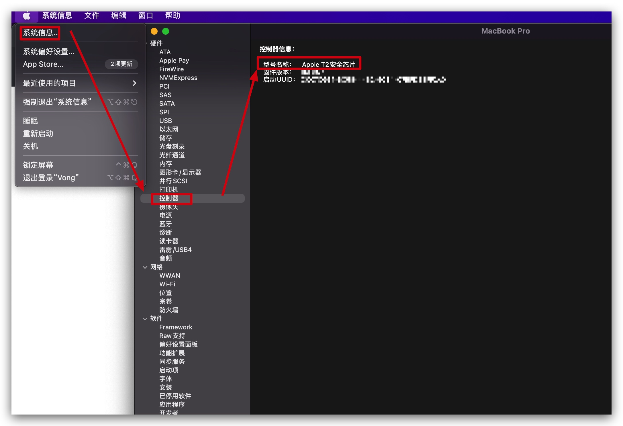 如果你不清楚自己电脑是否是 T2,可以通过如图方式确认,按住 Option 键,并点击左上角 查看 系统信息->控制器即可
